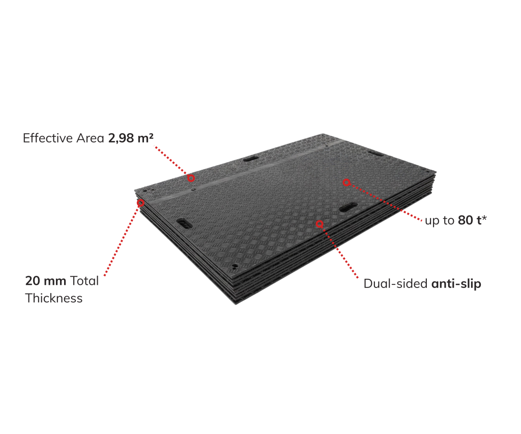 Terra LD is a high-performance reusable ground protection mat designed for access roads, working platforms, and protection of sensitive ground surfaces. It enables safe movement of vehicles and pedestrians while preventing ground damage, rutting, and surface degradation.